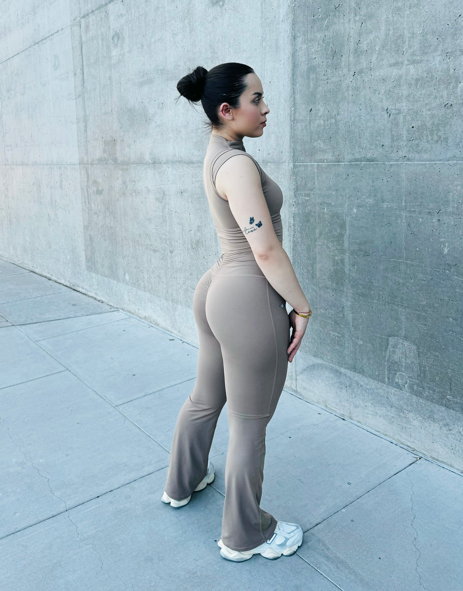 Embrace your sacred rhythm in this two-tone symphony of dark orange and mocha brown a color story inspired by root and sacral energy. Designed in buttery Nylon-Spandex that moves with your body like second skin, this high-neck top supports you in stillness and flow, while the sculpting push-up tights embrace your curves with bold softness. Runs slightly small for a divine fit, we recommend sizing up.