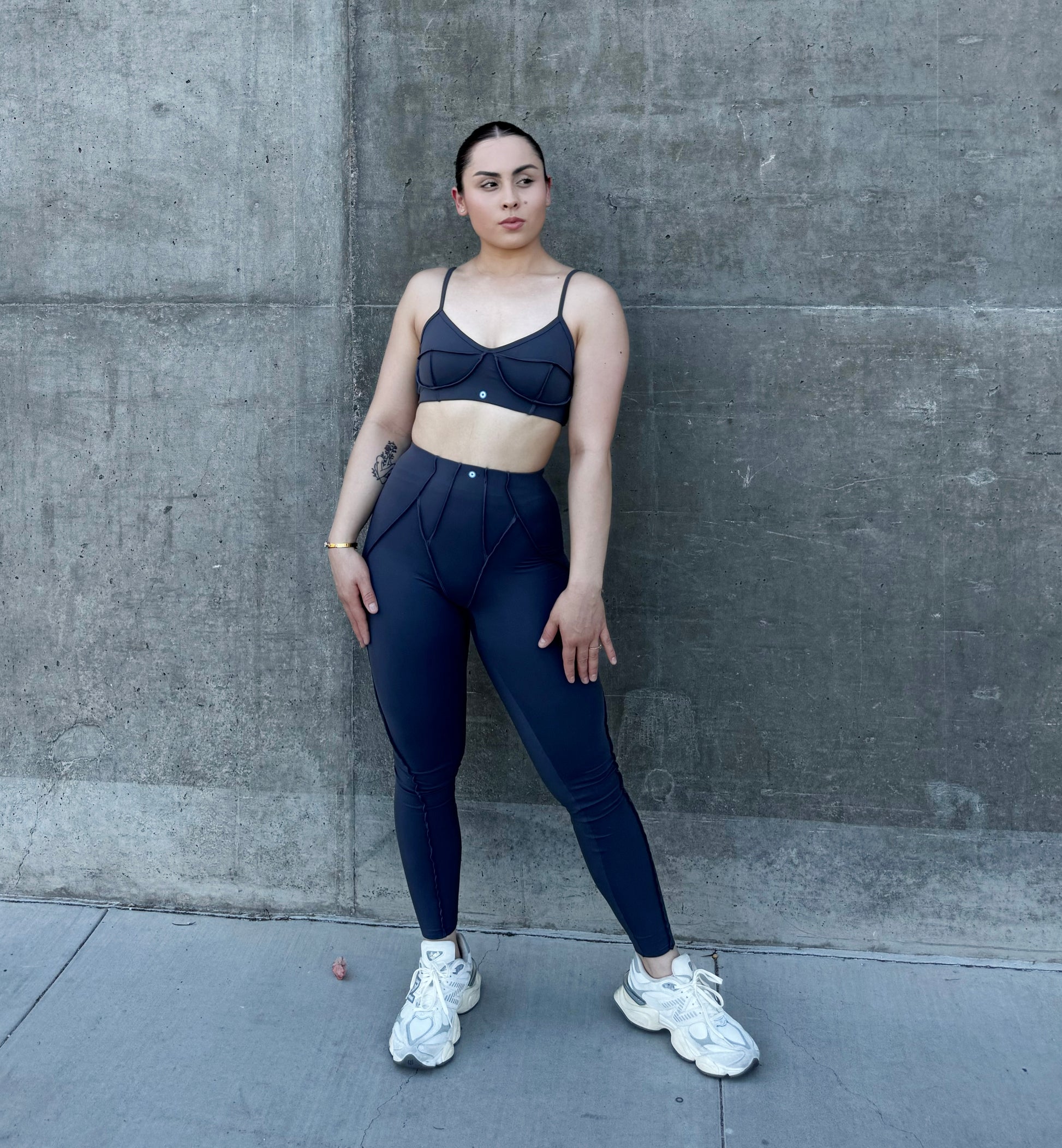 She doesn’t just rise she transcends. This dark gray set channels quiet strength and evolution. Designed in a breathable, eco-conscious Nylon-Elastane blend with seamless construction, it moves in harmony with your body and your becoming. The soft support bra offers comfort and freedom, while the high-waisted shaping trousers sculpt and lift with grace empowering your natural silhouette without restriction. Fits true to size.